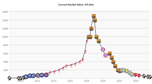 库蒂尼奥也曾是货真价实的亿元先生,他在2018年以1.35亿欧转会费从利物浦加盟巴萨。库蒂尼奥效力巴萨后巅峰身价曾一度高达1.5亿欧,但随后他的身价一降再降。“酷鸟”这些年接连效力拜仁、维拉、杜海勒和瓦斯科达迦马,均没能展现巅峰实力。